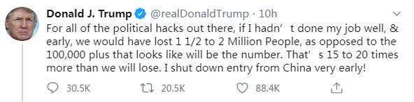 特朗普自夸:要不是我,损失是现在的20倍