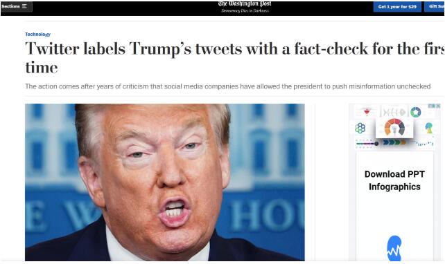 特朗普26日在推特上评价加州的“邮寄选票”,称选举将被操纵,“邮寄选票”实际上具有欺诈性。随后推特在特朗普的推文上标记了“获取邮寄选票事实”的标签,并将用户重新转到一个事实核查的页面,该页面包含一些媒体揭穿特朗普虚假陈述的新闻报道及一些其他用户的推文,为误导性的文章提供背景信息。《华盛顿邮报》说,推特这一举措在大选年让华盛顿和硅谷之间的紧张局势升级。