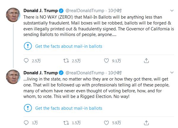 《华盛顿邮报》报道称,推特发言人凯蒂·罗斯伯勒(Katie Rosborough)表示,特朗普这两条推文“包含关于投票程序的潜在误导性信息,已被贴上标签,以提供有关邮寄选票更多的额外信息。”