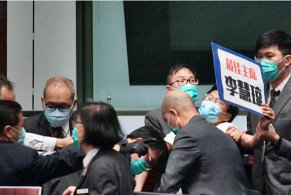 立法会今早再次开会辩论《國歌條例草案》,梁君彥宣布直接進入恢復二讀程序,會議開始不久,梁君彥要求朱凱廸離開會議廳,指他攜帶有侮辱性字句的標示牌進入會議廳,該字牌寫上「最佳主席 李慧琼」。立法會議員朱凱廸被多名保安抬離會議廳,引起民主黨胡志偉、議會陣線陳志全等民主派議員不滿,大叫「不如趕晒我地岀去直接三讀啦」。