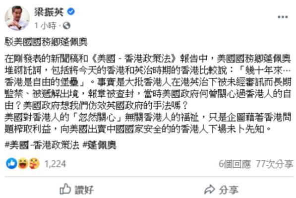 【香港商报網訊】美國國務卿蓬佩奧再次嚴重干涉香港事務。當地時間周三,蓬佩奧發表聲明指已向國會匯報特朗普政府已經不再視香港為「高度自治」,美國不再保證香港獲得特殊待遇。对此,全國政協副主席梁振英在社交網站發文表示,美國對港人是忽然關心,企圖藉香港問題榨取利益。