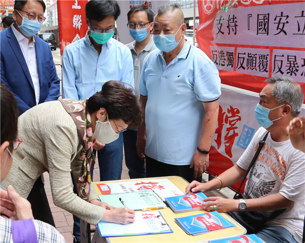 昨早,林鄭月娥與行政長官辦公室主任陳國基,一同到工聯會在北角的街站簽名支持「香港國安法」立法。林鄭月娥表示,今次國家安全法的訂立,有利於香港在經歷暴力創傷之後盡快恢復安定,相信其後經濟可逐漸恢復,繼而增加就業機會。她強調,維護國安是每一個人的責任,與我們的日常生活息息相關,並呼籲市民簽名支持。
