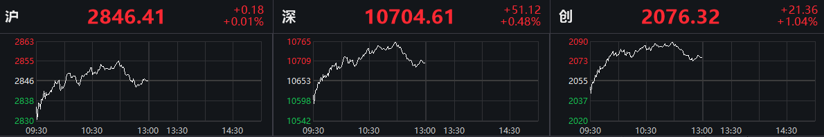 【香港商报网讯】两市低开高走,三大股指悉数翻红,深成指、创业板指一度涨逾1%。临近午盘,两市涨幅缩窄。截至午盘收盘,沪指涨0.01%,深成指涨0.48%,创业板指涨1.04%。
