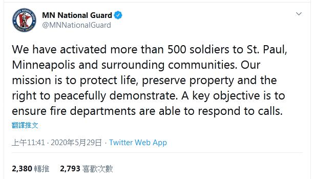 推文称,“我们已经动员了500多名士兵前往圣保罗、明尼波利斯以及周边社区。我们的使命是保护生命、财产以及和平示威的权利。一个关键目标是确保消防部门能够就相关呼吁做出回应。”