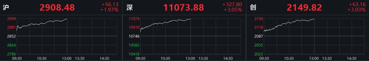 【香港商报网讯】两市高开高走,沪指重回2900点,深成指、创业板指双双涨超3%。截至午盘收盘,沪指涨1.97%,深成指涨3.05%,创业板指涨3.03%。