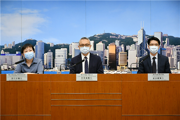 食衛局副局長徐德義(中)、衛生防護中心傳染病處主任張竹君(左)、醫管局總行政經理劉家獻一同公布疫情最新進展。徐德義呼籲市民不要掉以輕心。 記者 馮瀚文攝
