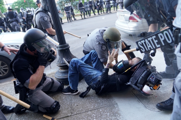 在肯塔基州路易斯維爾,一名參加抗議活動的男子被警察制服。路透社
