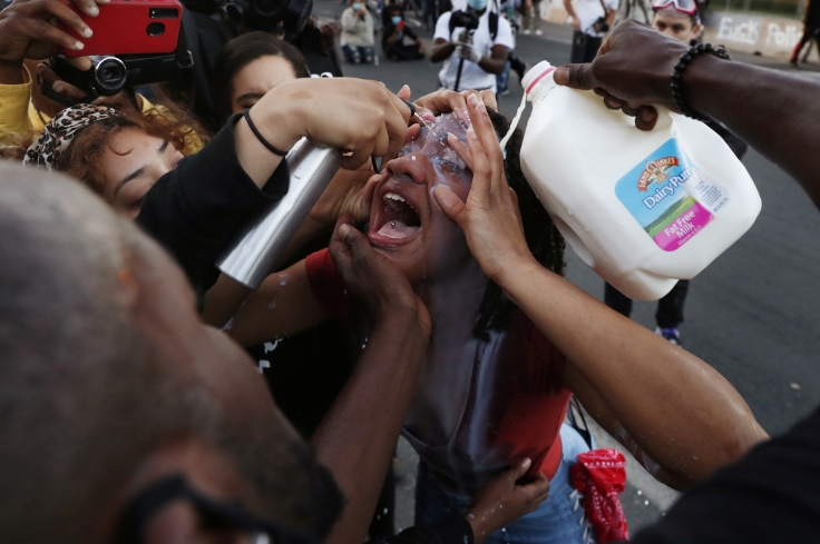 一名抗議者被警方噴射的胡椒水滋到,同伴幫其清洗。路透社
