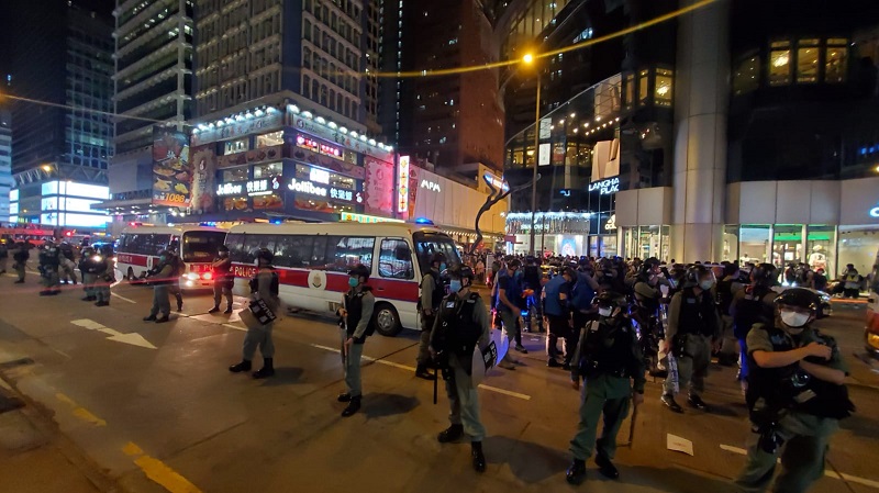 多部警車亦到場增援。警員其後帶走制服的人士,並繼續在場布防戒備,又呼籲在場市民離開,否則屬於參與非法集結,有部分在場人士則在場指罵警員。現場一段亞皆老街的交通受阻。現場情況危險及混亂,事件中,一名警員頭部及手部受傷。