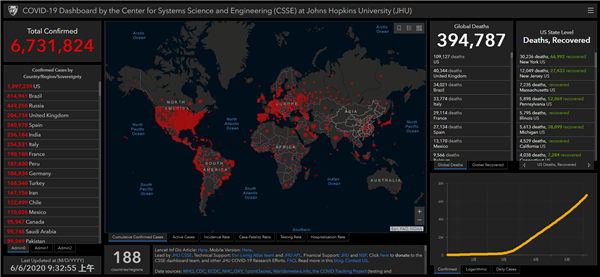 【香港商報網訊】美國約翰斯·霍普金斯大學發佈的實時統計數據顯示,截至香港時間6日約9時,全球累計確診新冠肺炎病例超673萬,累計死亡超39.4萬例。其中,美國累計確診超189萬例,累計死亡逼近11萬例。