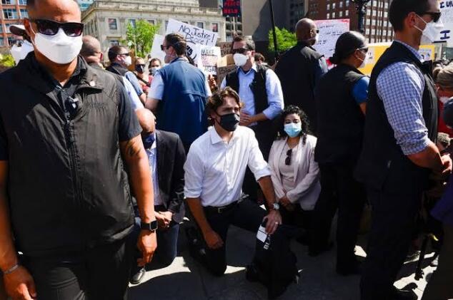当抗议人群开始高呼“黑人的命也是命”时,报道称,特鲁多也给出了相似的回应。随后他单膝下跪,人群发出一阵惊呼。