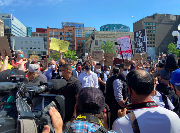 当天下午,数以千计的示威者高呼“I can't breathe”(我不能呼吸)涌入加拿大首都渥太华,抗议种族歧视和警察暴力。示威者游行至国会山前,跪下默哀8分46秒,以纪念弗洛伊德被警察跪压致死的最后时刻。