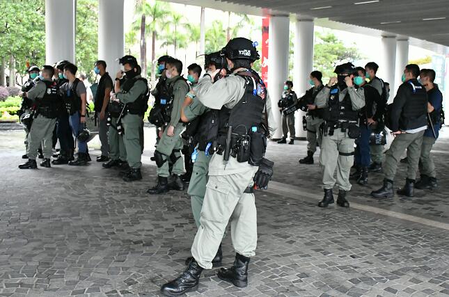 【香港商報网訊】記者周偉立報道:有團體擬於昨日發起九龍區遊行,惟警方早前已發出反對通知書,最終團體改為在尖沙咀鐘樓擺街站。昨午,尖沙咀鐘樓及尖沙咀碼頭有一批人聚集,不時有人叫抗議口號。大批防暴警員早在碼頭一帶部署戒備,有便衣警員拍攝周圍情況,而多輛警車則停泊在廣東道一帶。