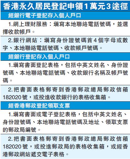 就海外港人領款,陳茂波表示,海外合資格港人若有銀行戶口,可網上登記,錢會直接落入戶口;選擇收支票人士可選擇郵寄表格,亦可經香港郵政網頁登記,但收支票時,則須親自簽名及取支票。
