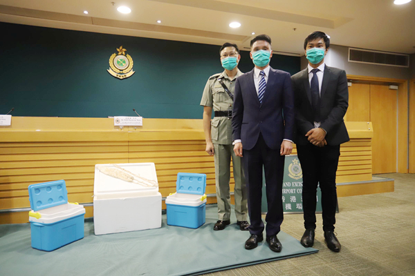 左起:劉青龍、胡偉軍及陳翰奇講述案情,旁為檢獲的石首魚魚肚。記者區天海攝