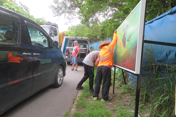 掛畫所用的物料都是「垃圾」,原本是扔往新界西堆填區的隔熱板,但其實可循環再用,方正板面正好用來展現藝術,於是從垃圾站執回來。繪畫者為三姊妹Cherri 、Mishell和Yanki,以名字的首個發音組成「車米人」藝術團隊。鄭偉君說,她們有繪畫天分,雖然是首次嘗試,但效果不錯,最重要是她們無私付出,義務創作,而有心人也有很多,包括在下白泥后海灣進行蠔礁保育的大自然保護協會,在畫作內容上提供意見;新界西堆填區蘇伊士新創建公司大力支持;一批義工任維修人員等。