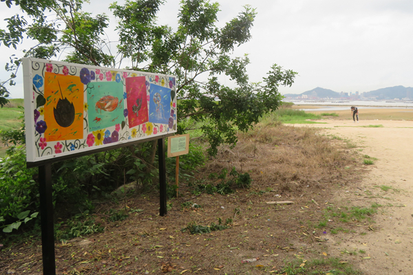 通往鴨仔坑泥灘的小路,其中一幅掛畫繪畫該地的生物馬蹄蟹、招潮蟹、彈塗魚及水母。