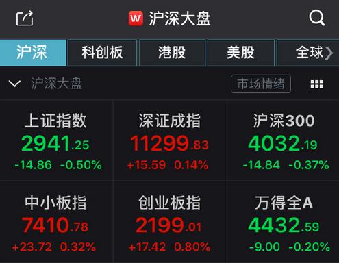 【香港商报网讯】A股三大指数震荡,创业板指逼近2200点,医疗行业领涨两市。电子烟、免疫治疗、水利建设、新零售、生物疫苗等板块表现强势,光刻胶、字节跳动、油改等概念领跌。截至发稿,沪指下跌0.50%,报2941.25点;深成指上涨0.14%,报11299.83点;创业板指上涨0.80%,报2199.01点。