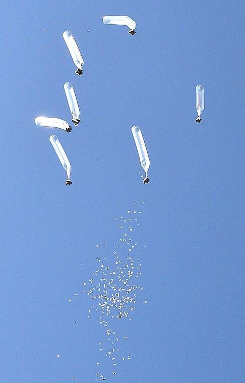 韩国“脱北者”用气球撒传单。韩国纽西斯通讯社