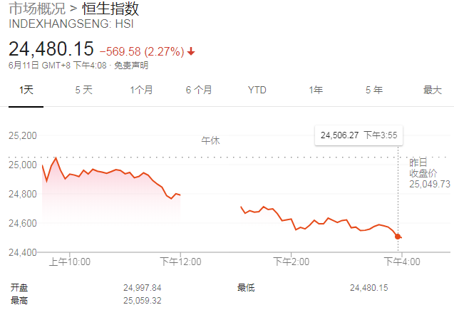 【香港商报网讯】6月11日消息,香港恒生指数今日低开低走,收報24480點,跌569點;國指收市報9944點,跌198點,成交額為1,424.3億元。個股方面,網易港股今日正式上市,收盤上漲5.69%,報130港元。