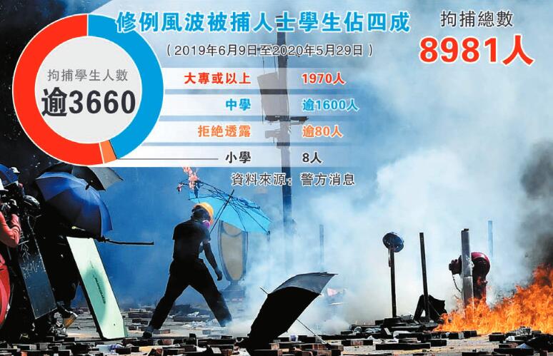 發言人表示,「修例風波」以來,學生和孩子已經付出了其難以承受的慘痛代價。相當數量的青年、學生扔下書本、衝向街頭,參與激進暴力犯罪。香港中文大學、香港理工大學一度淪為暴徒的「戰場」和「兵工廠」,寧靜校園黑影幢幢,書香聖地硝煙瀰漫。截至5月29日,因參與「修例風波」相關違法活動被捕的8981人中,超過四成是學生,年齡最小的才11歲。年僅12歲的學童三次因參與違法活動被捕,年僅13歲的孩子身藏兩枚汽油彈,年僅16、17歲的少年攻擊清潔工羅伯致其死亡。青年學生涉及的罪名包括參與暴動、非法集結、傷人、襲擊致造成身體傷害、縱火、刑事毀壞、藏有攻擊性武器、襲警等等,其中許多都是重罪,這種案底和污點將長期沉重壓在他們的身上,本該有的美好前途毀於一旦。所有有良知的人都倍感痛心、揪心、憂心。人們不禁要大聲追問:是什麼讓青年學子黑白不分,是非顛倒?是什麼讓純潔的學生心中充滿仇恨,變得如此殘忍暴力?是什麼誘引他們走上了違法犯罪、破壞家園、對抗國家的黑暗之路?