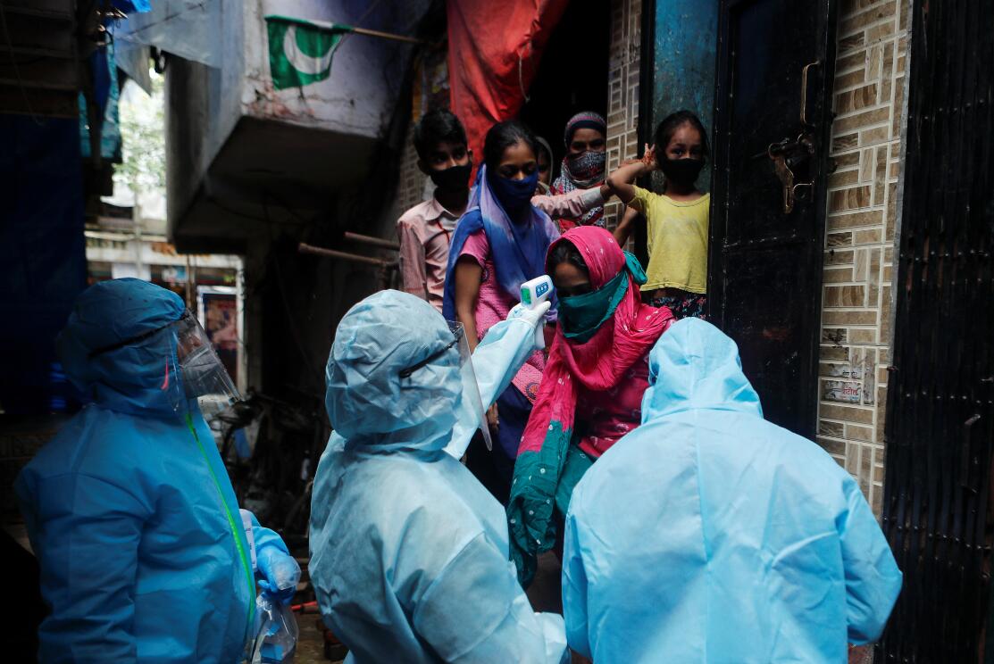 印度防疫人員到孟買貧民窟替居民量度體溫。路透社