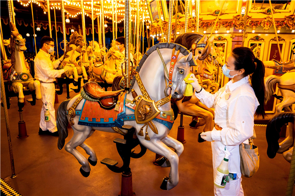 迪士尼樂園後天重開,員工為機動遊戲 「旋轉木馬」 進行清潔,做好預防措施。中通社