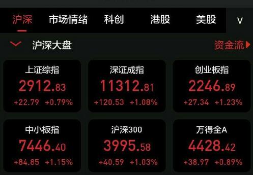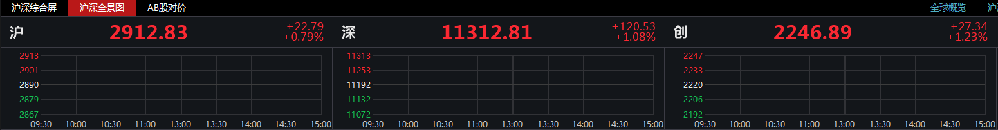 截止今日开盘,沪指报2912.83点,涨0.79%;深成指报11312.81点,涨1.08%;创指报2246.89点,涨1.23%。