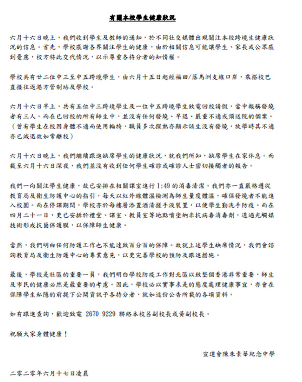 校方今日(17日)凌晨發通告澄清,指6月16日早上當日共有五位中三及一位中五跨境學生致電回校請假,其中三人報稱發燒。但強調,所有回校的師生沒有發燒、早退或須送院個案,使用輪椅的涉事學生沒有發燒,僅因身體不適需使用輪椅並在放學時間如常離校。