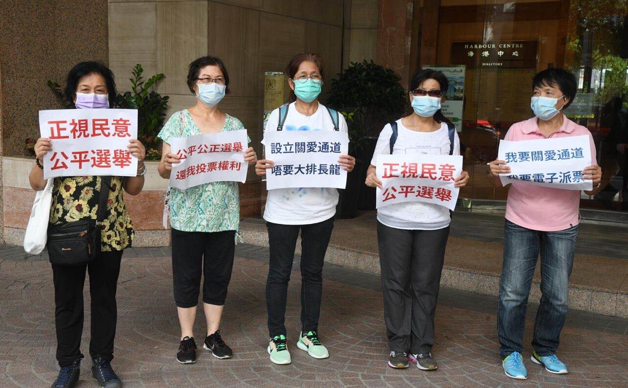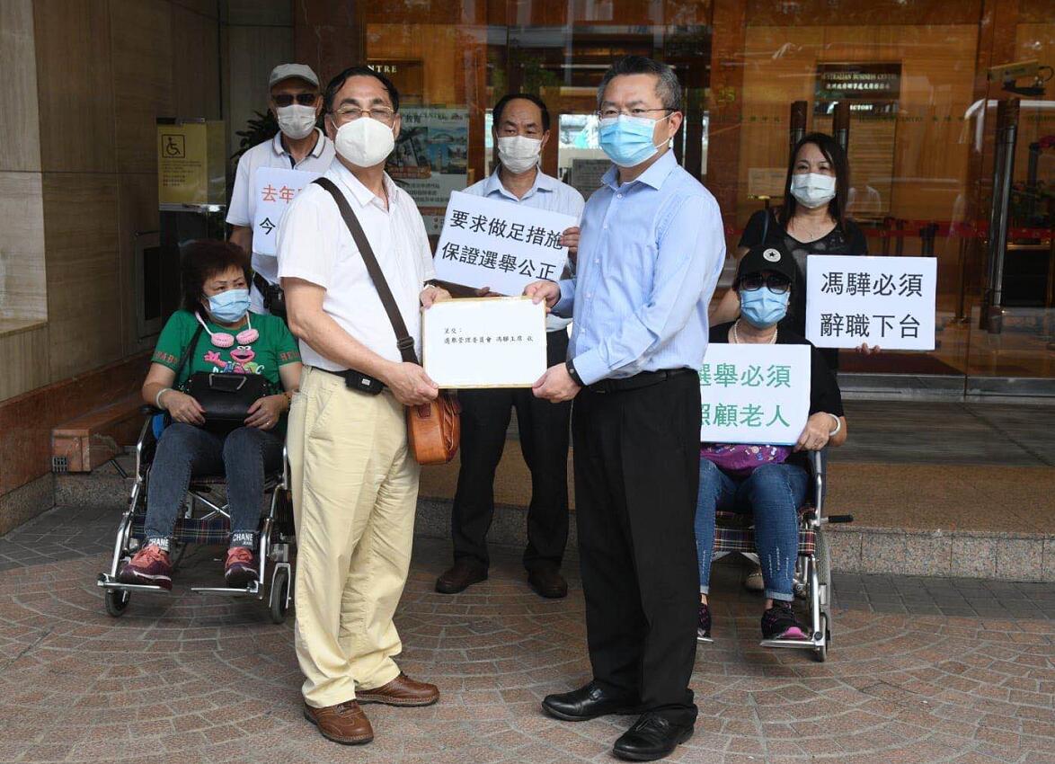 【又訊】今日下午共有7個不同團體和自發組織的市民來到灣仔選管會請願,要求選管會提供一個公平、安全的選舉環境。分別有「北區和平公正選舉關注組」、「沙田友關注選舉聯盟」、「港島東社區服務協進會」丶「香港正義市民」及3批自發市民,當中有坐輪椅的老婆婆及傷健人士。