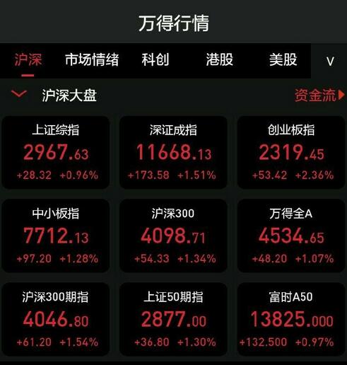 【香港商报网讯】沪指今日低开后迅速翻红,创业板指涨逾2%站上2300点整数关口,刷新近50个月新高。午后,三大股指震荡拉升,沪指一度涨超1%。截至收盘,沪指涨0.96%,深成指1.51%,创业板指涨2.36%。