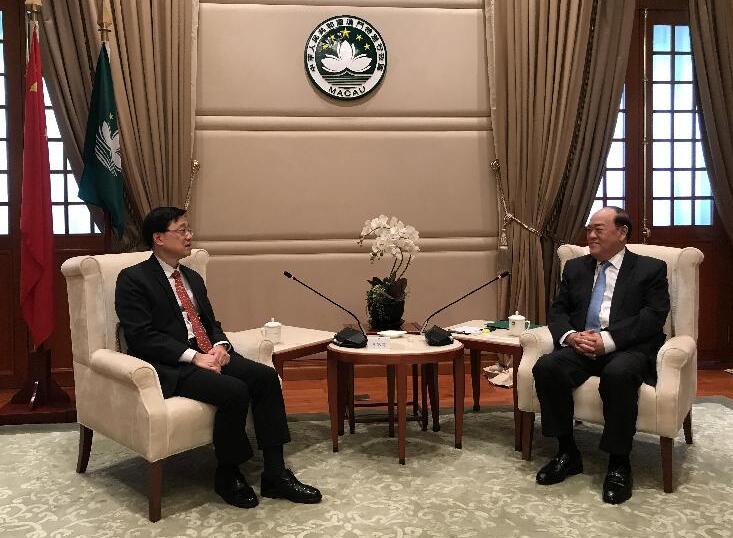 保安局局長李家超(左)今日下午拜訪澳門特別行政區行政長官賀一誠,了解澳門在維護國家安全方面的工作及最新發展。政府新闻处