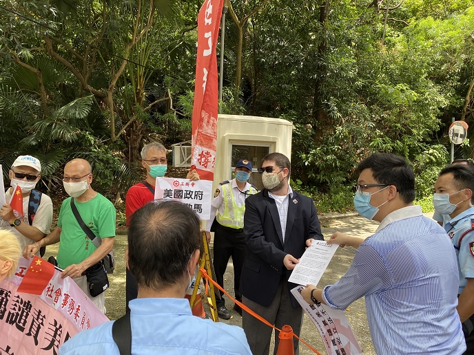 【香港商報網訊】记者李铭欣報道:美国针对香港国安立法诋毁不断,使香港市民感到愤怒。今日工联会社会事务委员会一行,手持“强烈谴责美国干预”,“立即停止损害香港”及“一国两制不容诋毁”等标语,前往美国驻港澳总领事馆示威,他们向领事馆职员递交请愿信后和平散去。
