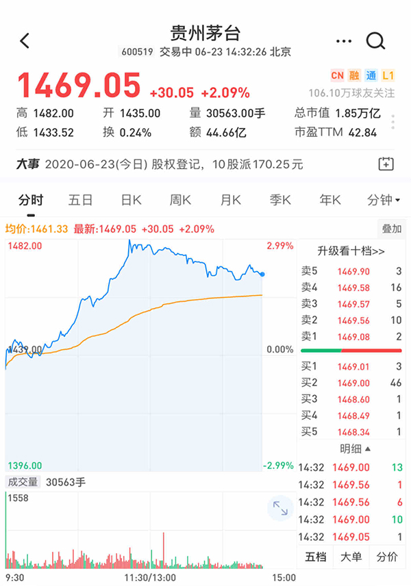 【香港商报网讯】貴州茅台(600519.SH)今日(23日)股價再創新高,最高報1,482元(人民幣,下同),升2.99%,市值達1.86萬億元,超過「宇宙行」工商銀行(01398.HK 601398.SH)成為A股企業市值第一位。