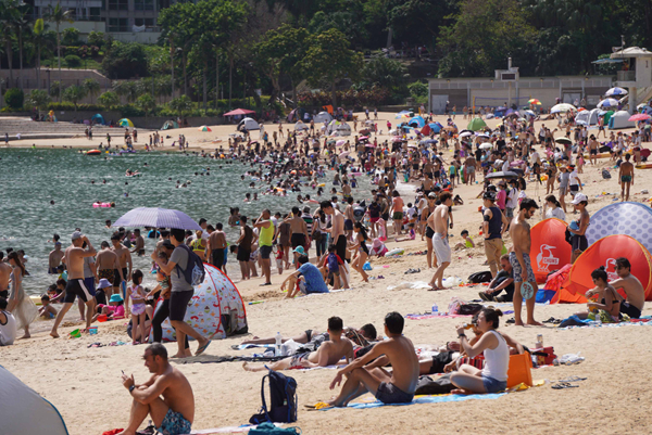 雖然今年端午節沒有龍舟賽事,但亦有不少市民選擇游「龍舟水」過節。其中在清水灣二灘,前往消暑的泳客人頭湧湧,太陽傘亦佔領整個沙灘,附近的停車場全部爆滿。有市民表示,趁節日帶小朋友游龍舟水,又指趁假日天氣好,除下口罩,去沙灘休息一下。
