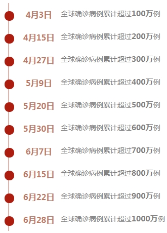 全球确诊从100万例到1000万例,共歷时86天。其中,从100万到200万歷时12天,而从900到1000万则只用了6天,疫情仍在加速扩散的过程中。