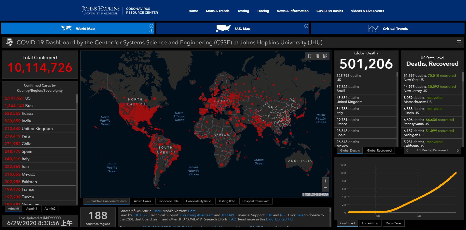 新型冠状病毒疫情爆发迄今已半年多,美国约翰斯·霍普金斯大学发布的实时统计数据显示,截至香港时间6月29日8时30分左右,全球新冠肺炎确诊病例达10114726例,死亡病例达501206例。然而,疫情仍没有丝毫停止扩张的迹象。