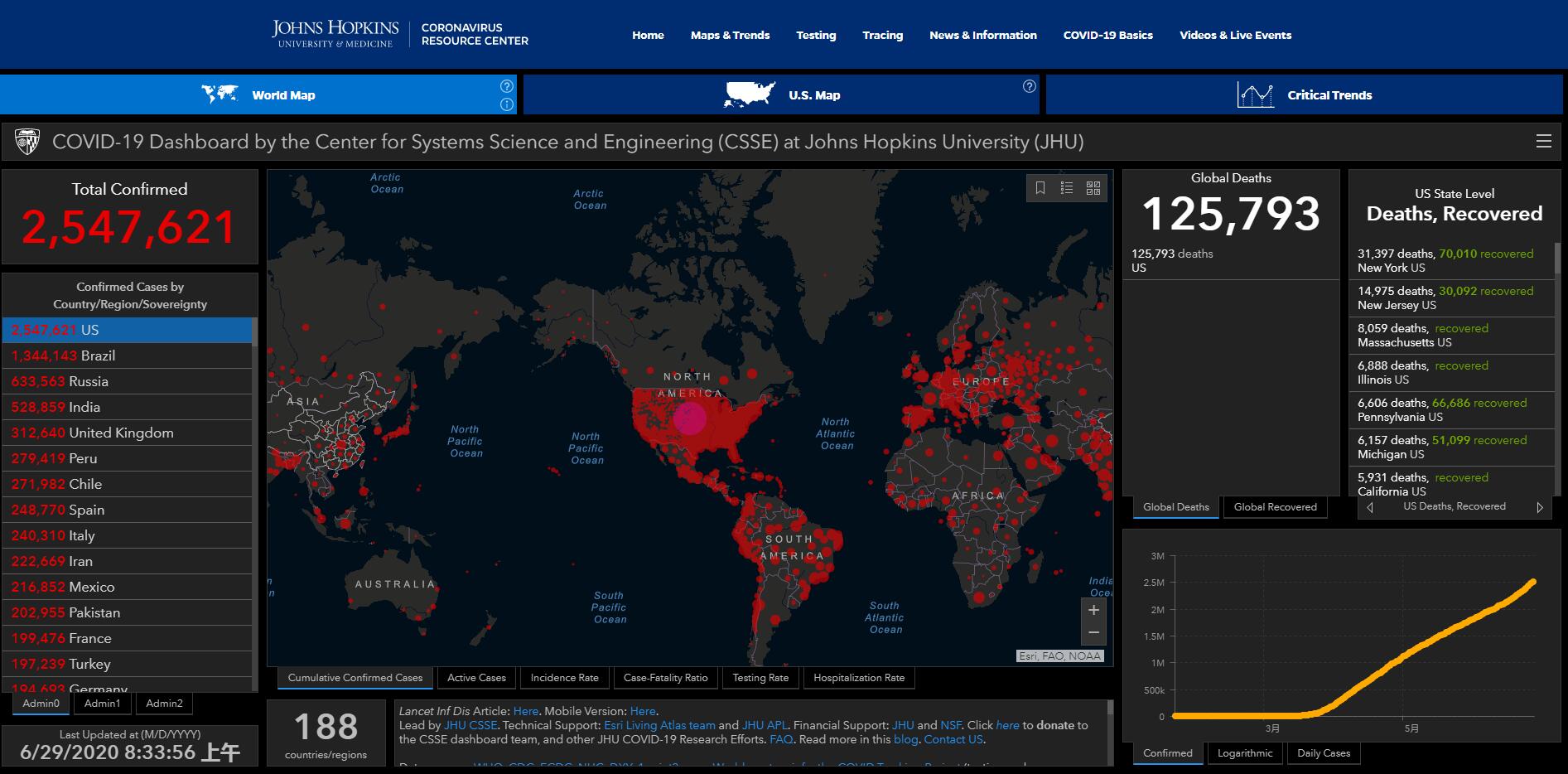 在各州大规模重启经济活动後,美国单日新增确诊数字出现明显回升。截至香港时间29日8时30分左右,美国累计确诊病例数逾250万例,达2547621例,死亡超12.5万人,达125793例。