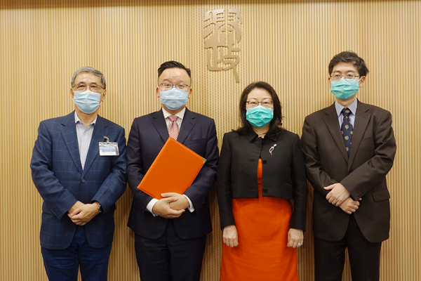 律政司司長鄭若驊(右二)上月與一邦國際網上仲調中心(eBRAM 中心)時任主席(現任副主席)陳曉峰(左二)簽訂諒解備忘錄。