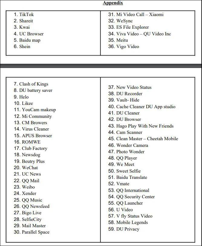 报道指出,印度电子和信息技术部声称,根据该国《信息技术法》第69A条及相关法律条规,决定禁用59款应用程序,这些应用程序从事的活动“有损”印度的主权与印度的完整性、国防、国家安全和公共秩序。
