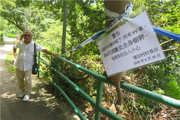 欄杆承托的樹幹掛了提醒告示 ,並有警方封鎖線,左為窩田村村長鄧家洪。