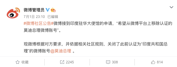 據印度亞洲新聞國際通訊社(ANI)7月1日報道,由於莫迪的微博賬號為VIP賬號,在申請注銷時需要經過「複雜的流程」,因此,印度不得不啟動官方流程來處理此事。
