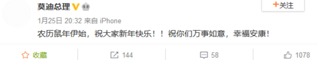 而他的最後一條微博內容,是今年1月25日向中國網友發出的鼠年祝賀。