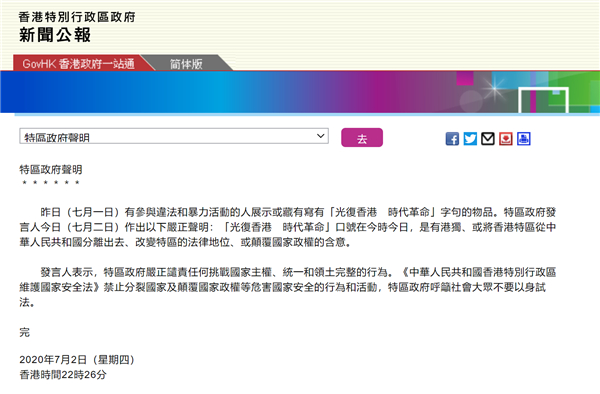 【香港商報网訊】對於7月1日有參與違法和暴力活動的人展示或藏有寫有「光復香港 時代革命」字句的物品,香港特區政府發言人2日作出以下嚴正聲明:「光復香港 時代革命」口號在今時今日,是有「港獨」、或將香港特區從中華人民共和國分離出去、改變特區的法律地位、或顛覆國家政權的含意。