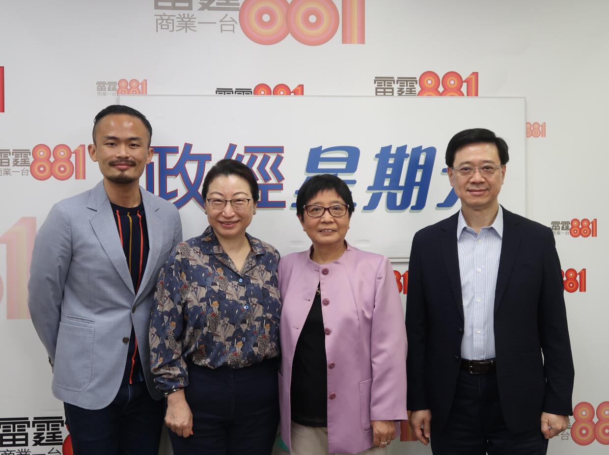 鄭若驊(左二)及李家超(右一)接受商台訪問,闡釋香港國安法。