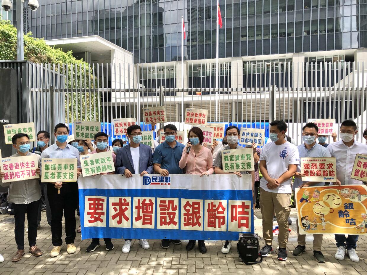 民建聯主席李慧琼、立法會議員柯創盛、鄭泳舜、民建聯副秘書長黎榮浩、顏汶羽等成員,昨日聯同一批銀齡長者到政府總部願請願。他們向勞福局遞交請願信,以及一張居民巧手心意製作的銀齡咭,寓意這是銀齡居民急切的期盼。