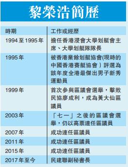【香港商報訊】記者林駿強報道:今屆區議會中出現多位對地區工作認識不多「素人」,不過民建聯副秘書長黎榮浩就不是「素人」,本身擁有多年扎實的地區議政經驗。他在1999年第一次參加區議會選舉,擊敗資深的反對派對手、民協廖成利,成為黃大仙區議員;2003年經歷沙士等連串風波,亦連任成功;惟在去年的區議會選舉未能連任。本身擅長划艇的他不怕困難,認為「一步一腳印」,每一步發展都要盡自己努力做得最好。他坦言建制派一向都未試過「順風順水」,又指是次修例風波的大浪比2003年時更大、更急。不過,他深信民意始終會走向建制派,市民會了解這是他們的最佳選擇。