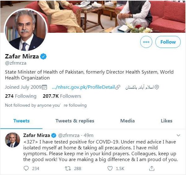 巴基斯坦卫生部长米尔扎个人社交媒体账户截图。