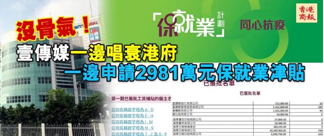 一直以来,壹传媒旗下《X果日报》不断唱衰特区政府,并一直质疑甚至批评港府的保就业计划是「公帑代出粮」,但《X果日报》及旗下多间公司同样自打嘴巴申请该计划,获批补贴总额最少2981万港元。