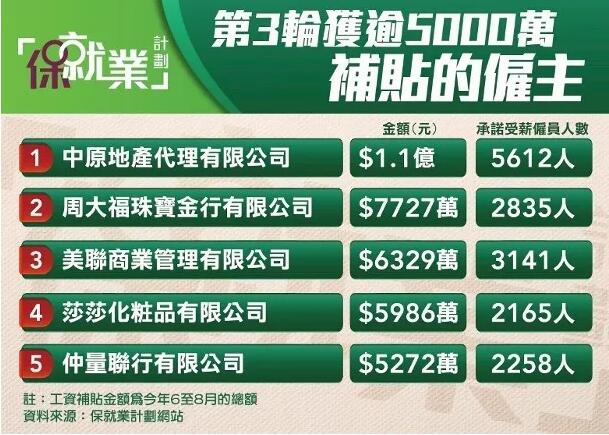 其中,在此轮获得最多补贴的是中原地产代理有限公司,涉及资助额达1.1亿港元,承诺受薪雇员人数为5612人。